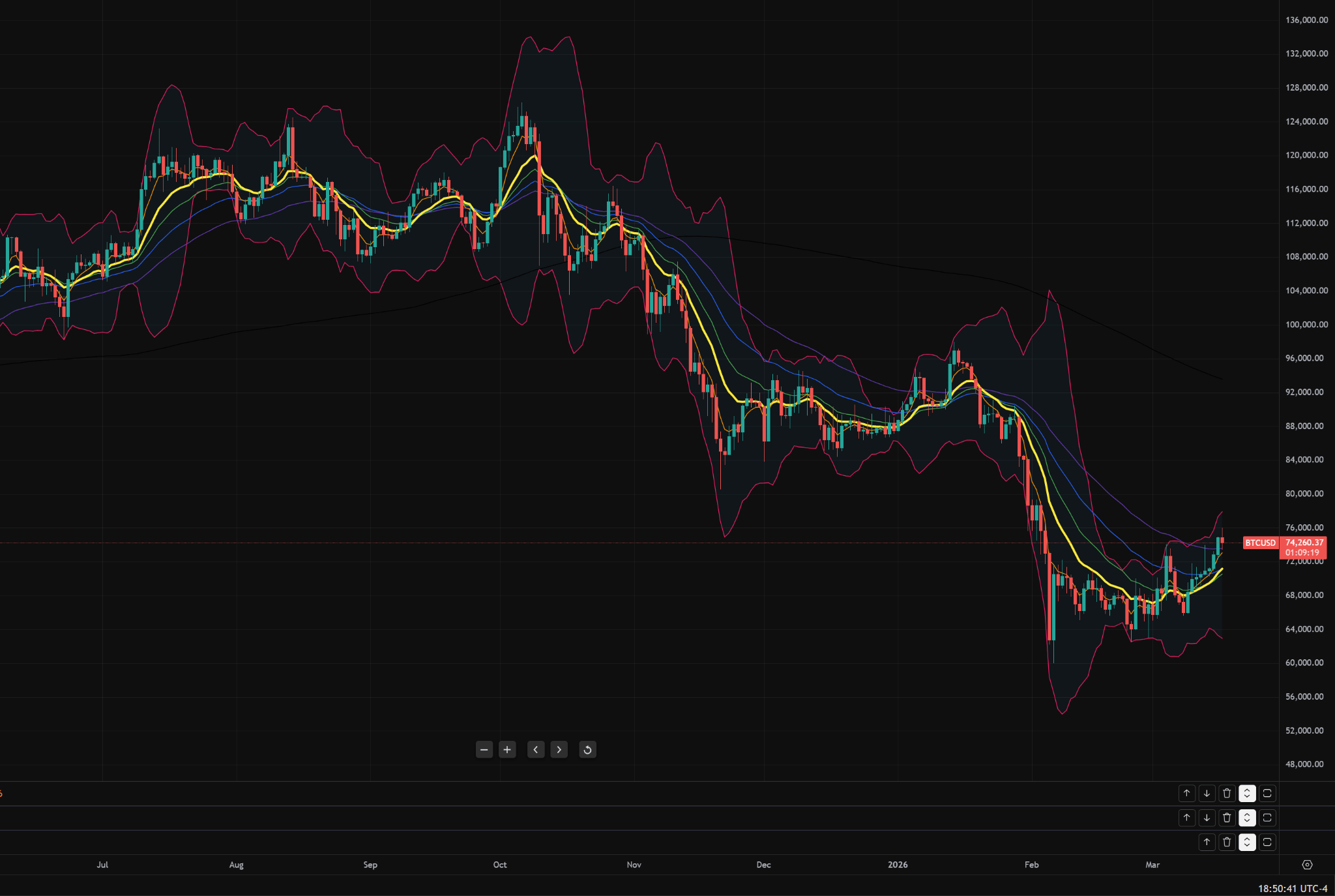 After a brief attempt at reversing back into an uptrend in early January, BTC succumbed to another leg down. Something notable to me at the time was just how long it stayed below the yellow MA, which is, in my opinion (as well as Ree’s), the most important of the “rainbow” MAs. You can even see how price began to accelerate once BTC broke above it the second time (after the too-steep first breakout).