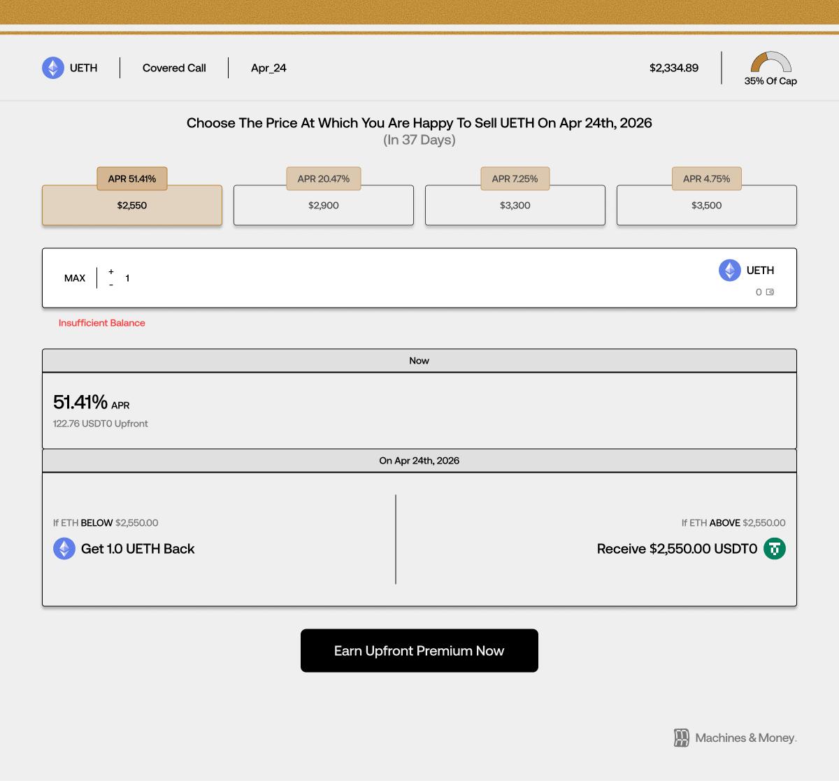 This specific vault manages covered call positions (buy the underlying asset, sell an out-of-the-money call option) on UETH, which is a version of staked ETH on the Hyperliquid blockchain. It’s a short term strategy – the call options have an expiration date of April 24th – but depositors can specify the price they want to sell at, as well as see their estimated return if they were to sell at that price.