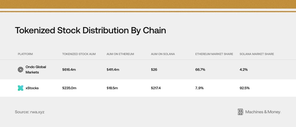 The two leading platforms, Ondo and xStocks, had zero tokenized stocks until last June. Since then, they’ve tokenized a combined $833M worth of over 200 different tickers – giving them a combined market share of ~83%.