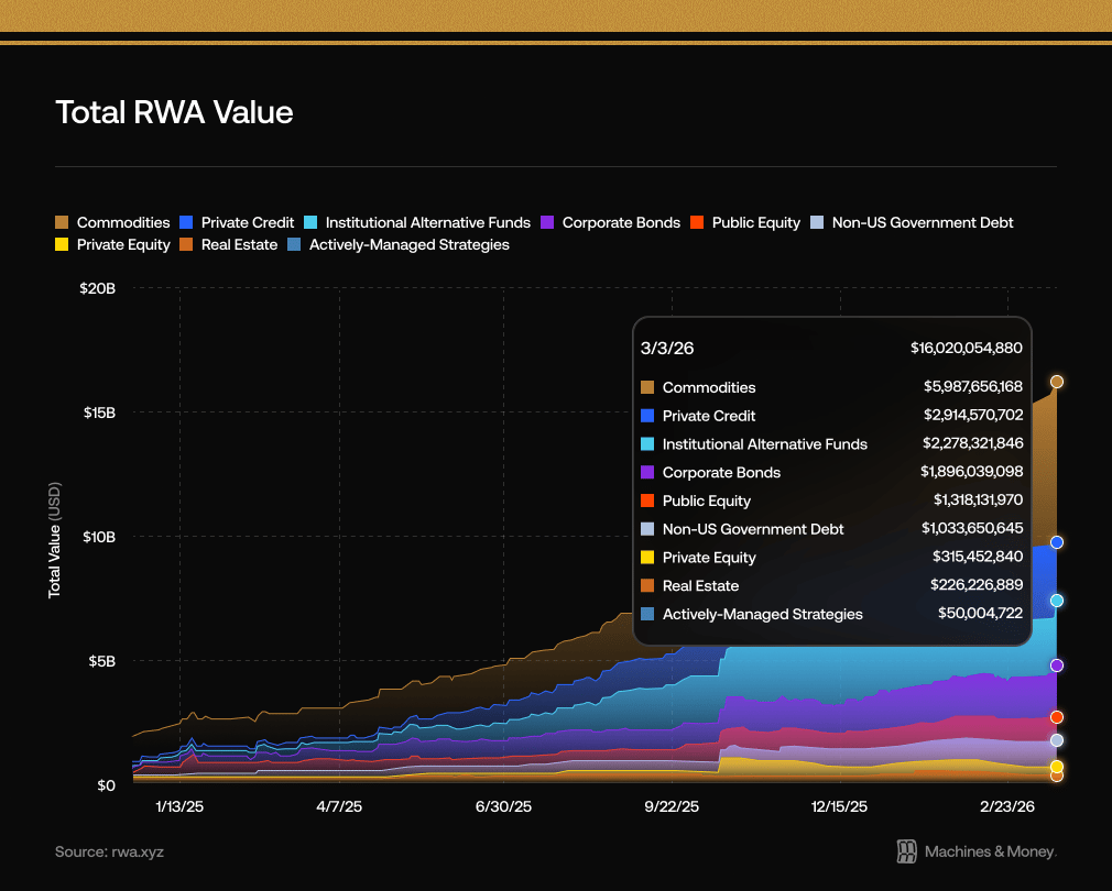 If you take out tokenized Treasuries, the growth is even steeper: $1.8B to $16B, or 889%!