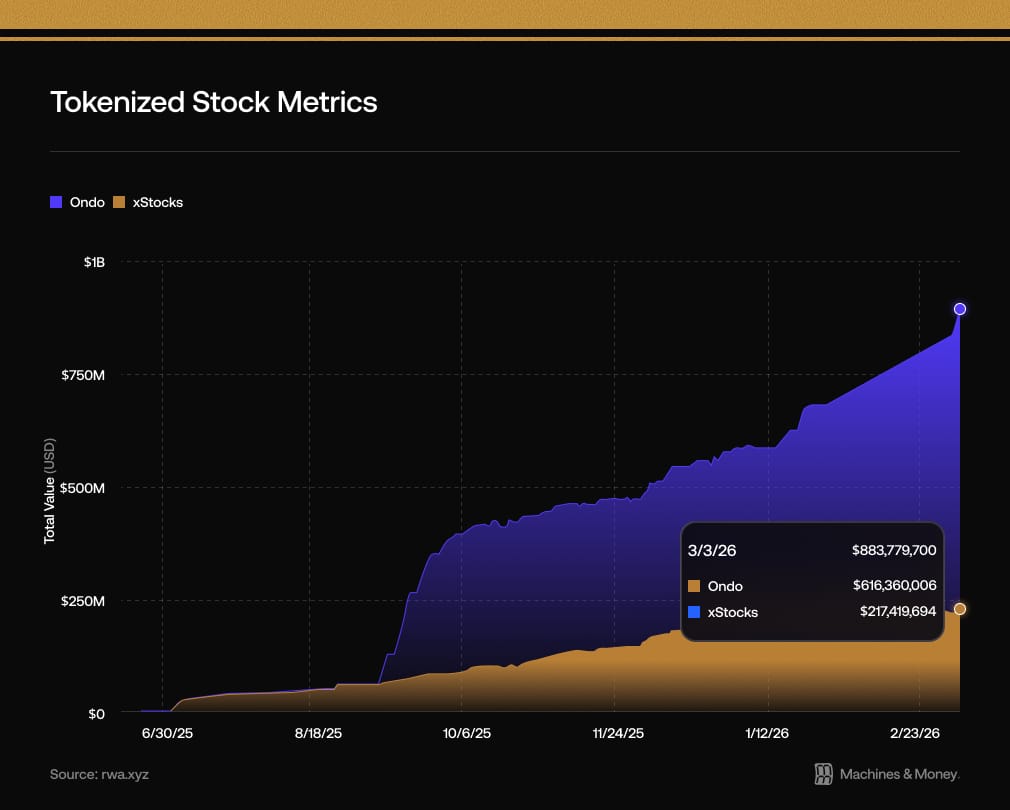 The total value of tokenized stocks crossed $1B for the first time.