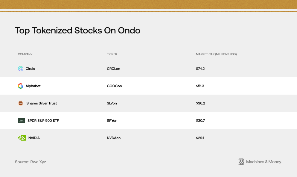 Ondo’s Global Markets platform is where users can access hundreds of individual tokenized stocks and ETFs.