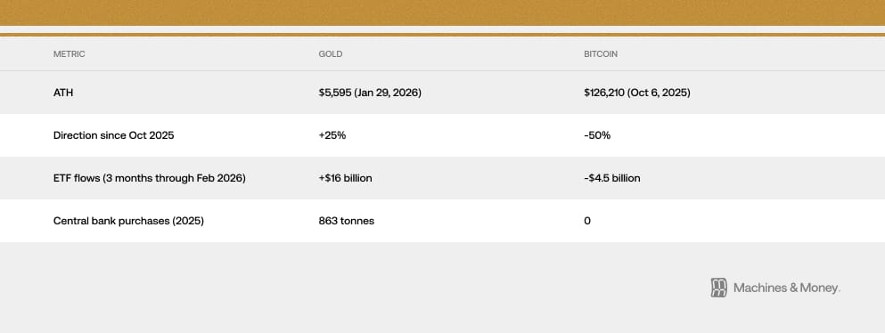 This was the exact environment in which Bitcoin's "digital gold" properties should have manifested. The directional divergence since October 2025 tells the story: gold rose from $4,400 to an all-time high of $5,595, while Bitcoin fell from $126,210 to the mid-$60,000s. Two assets supposedly serving the same monetary debasement hedge function moved in opposite directions during the most favorable conditions imaginable for that function. Instead: