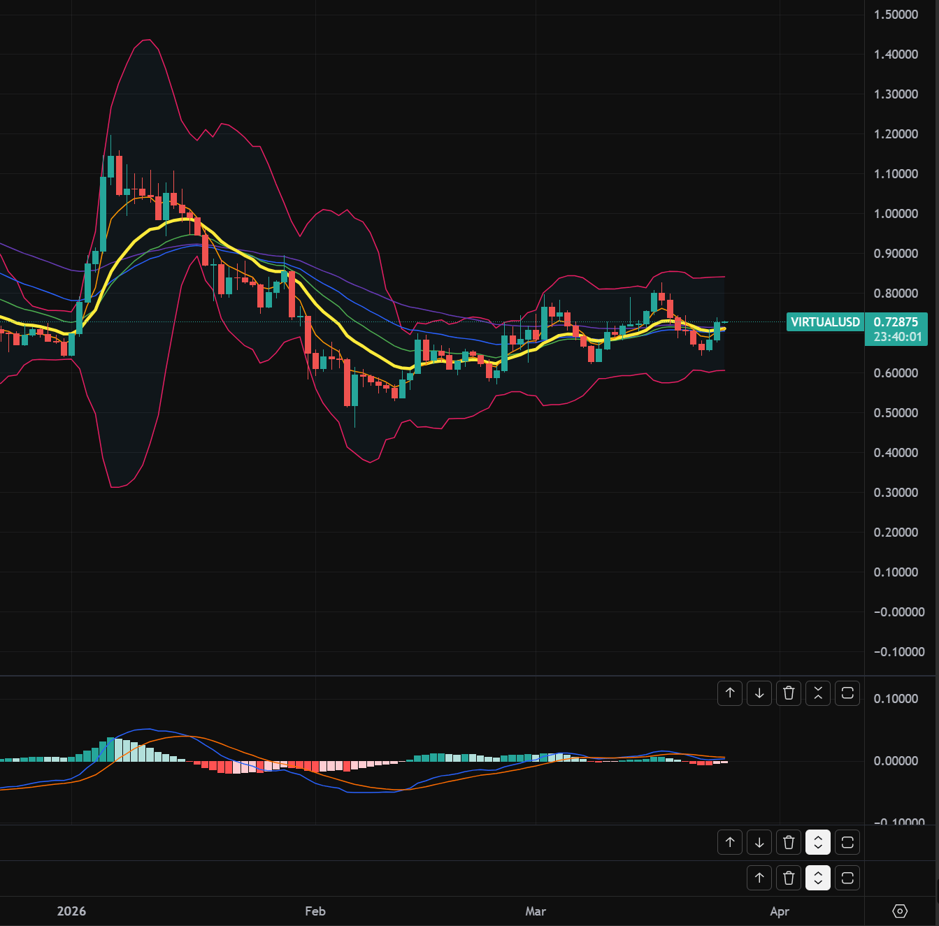 While VIRTUAL isn’t in an uptrend, its daily chart is showing an even more bullish setup than BTC. Not only is the MACD in a similar pattern, but the price has put in 3 straight higher lows and lower highs: