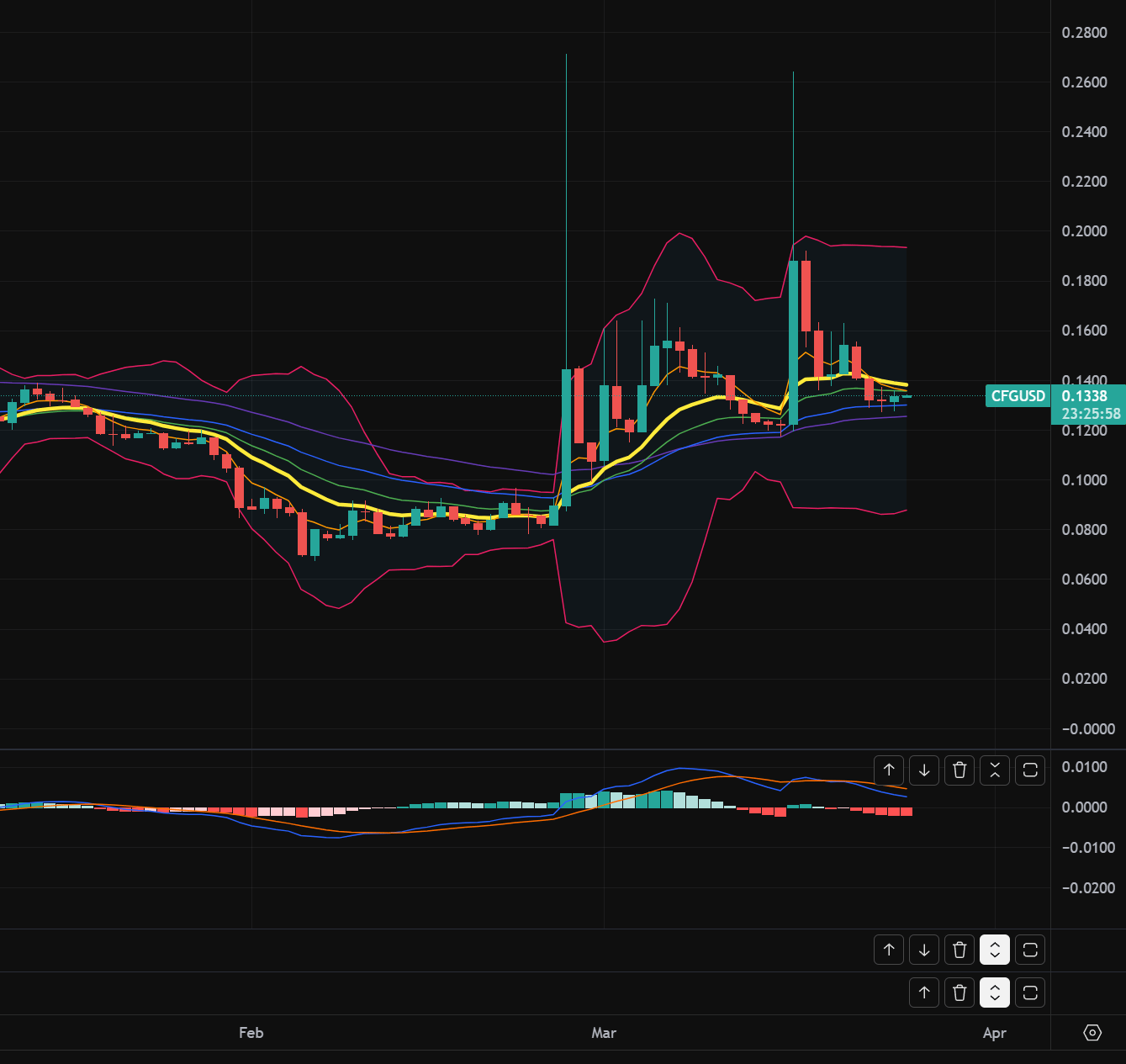 CFG is also showing potential as it looks to bounce off the purple MA – the most long-term of the group. The last time it fell to that level, there was a huge price spike (which I’ll touch on in just a minute).