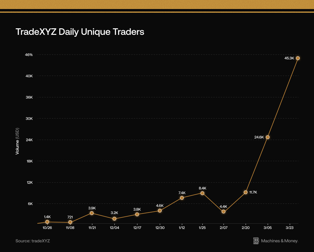 The parabolic rise of tradeXYZ has revealed massive demand to bring traditional markets onchain. For example, the amount of unique traders using the app has increased 10x since early February: