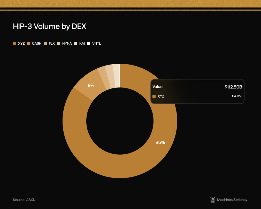 This enabled tradeXYZ to host markets for, theoretically, any asset class. And so far, tradeXYZ has dominated HIP-3 asset volume; it currently accounts for 84.9% of all HIP-3 volume, totalling $112B.