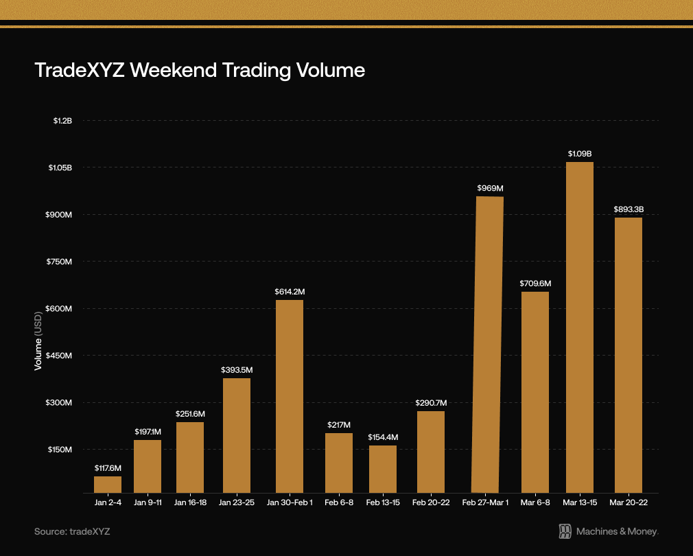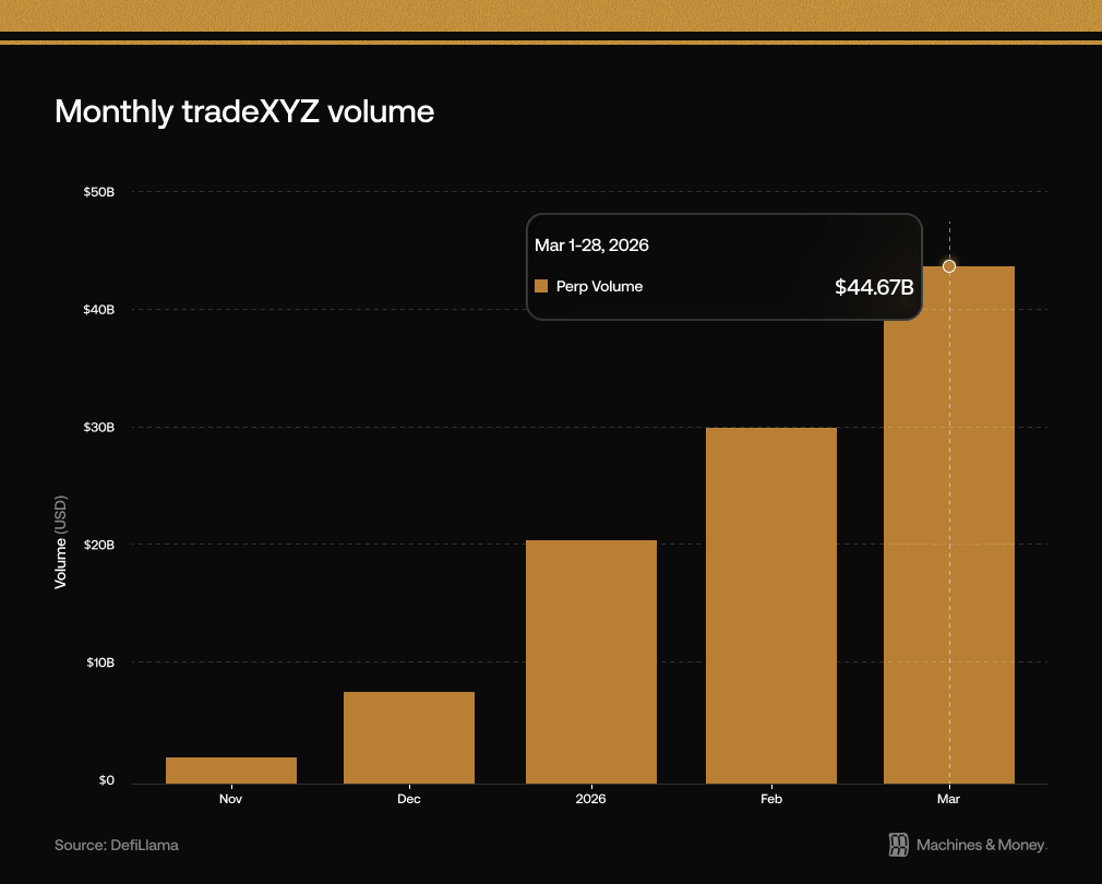 Over the past several months, traders have flocked to tradeXYZ to trade commodities like gold, silver, and oil, as well as indices like the S&P 500 and mag-7 stocks like NVDA and TSLA. So far this year, the app has generated ~$100B in trading volume – nearly half of which has been generated in March: